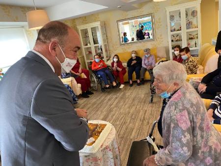 El presidente de la Diputación no ha querido perder la oportunidad de acudir al Centro de Servicios Sociales La Fuencisla para felicitar a una de las residentes, María Peñas, que cumplía 101 años con la misma vitalidad que celebró su centenario el año pasado. Miguel Ángel de Vicente ayudó a María a soplar las velas de su tarta y también pudo comprobar que el deseo que ella le pidió en su centenario, se había cumplido con la rehabilitación de la zona exterior de la Unidad de Convivencia La Olmeda, que se ha transformado en una agradable zona para poder pasear y disfrutar de las buenas temperaturas que nos acompañan estos días. En esta adecuación se han invertido casi 79.000 euros que han supuesto la adaptación y mejora de estos espacios exteriores para potenciar la autonomía personal de las personas que viven en el pabellón central.